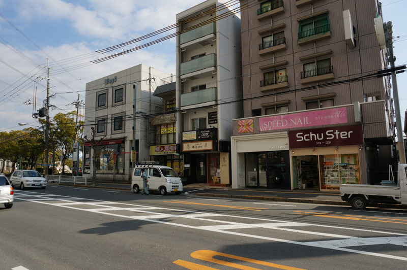 こっちに行くとすぐに楠葉中央公園があって楠葉朝日から男山のほうへ。隣には塾の「ブレーン」があります。もう一つ隣の「PEOPLE」という服屋さんがあったところはずっと空いたままですね。