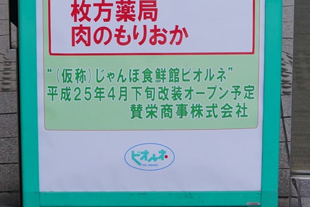 『”(仮称)じゃんぼ食鮮館ビオルネ”平成25年4月下旬改装オープン予定』。