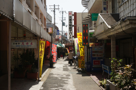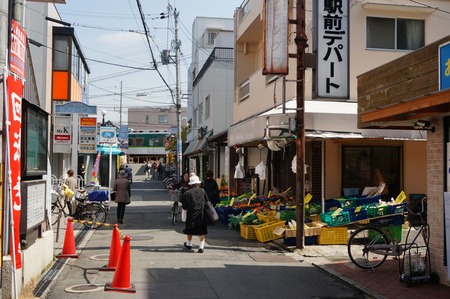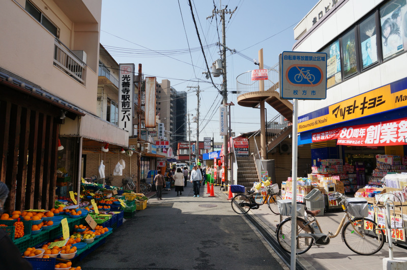 逆方向から。向こうに京阪電車が見えます。こちらからだと光善寺駅前デパートの看板を右へ入ります。