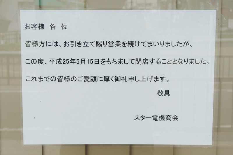 5月15日で閉店されたそうなのでひと月ほど前ですね。テントには「スターデンキ」と書いてますが正式には「スター電機商会」という名前のようです。