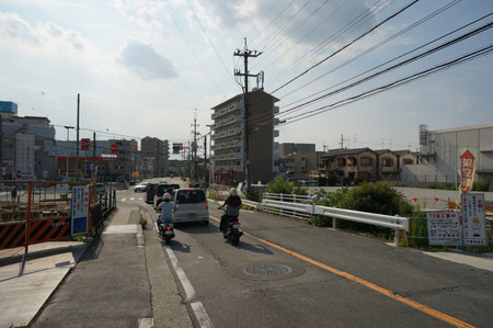 あっちに行くと旧1号線(府道13号線)のかささぎ橋へ。信号を左に曲がるとイズミヤ枚方店のほう。