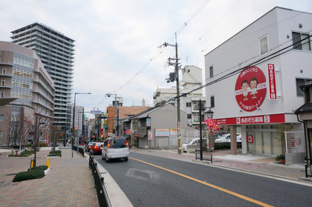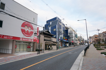 こっちに行くと香里園駅。あおぞら薬局の住所は寝屋川市香里本通町で、写真中央のグレーの建物のところからは枚方市香里園町です。