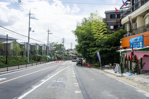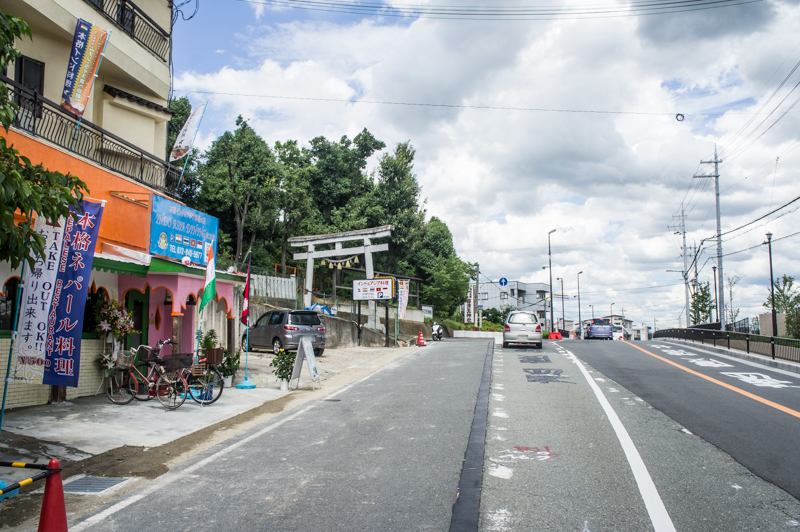 こっちにいくとケンタッキーやロイヤルホストがある国道1号線の交差点「池之宮北」。すぐそこに百済王神社の鳥居が見えています。