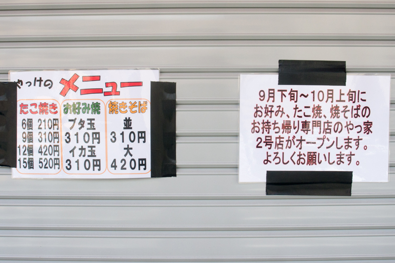 9月下旬~10月上旬にお好み焼き・たこ焼き・焼きそばのお持ち帰り専門店「やっ家」の2号店がオープンとの記述。(メニューは記事作成時点での料金です)