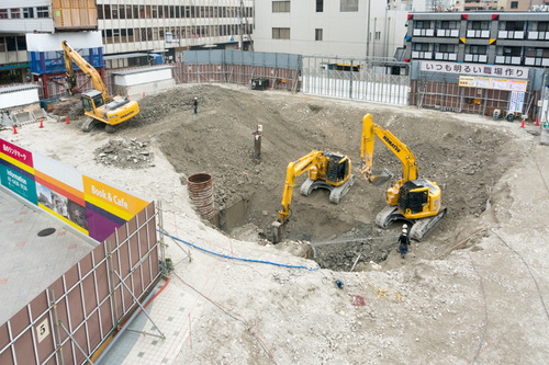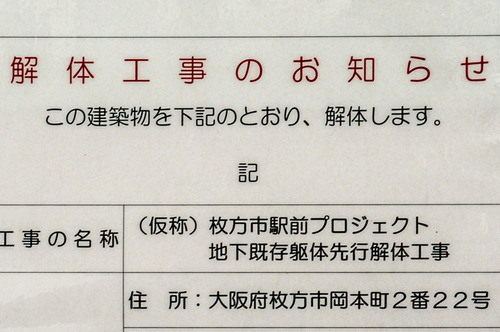 近鉄百貨店跡地の地下部分を解体してる 投稿日 2014年11月2日 20:24 著者 カズマ カテゴリー 開店・閉店 枚方市駅前の近鉄百貨店跡地で地下部分の解体工事が始まってます。 歩道橋からだとよく見えます。 面の部分が人工物っぽいです。 看板に「地下既存躯体先行解体工事」との記載が。 一度はすっかり更地になって重機も見られなくなり、最近再び重機が登場して工事の音がすごかったのでいよいよ新商業施設の建設に着工かと思ったんですが、近鉄百貨店時代の地下部分の解体でした。地上部分と地下部分ではこうして分けないといけないぐらい全然違う作業なのかもしれないですね。 →近鉄百貨店跡地・新商業施設の関連記事一覧 (すどん@ひらつー) シェア ツイート LINE 枚方T-SITE 枚方市駅 枚方市駅・枚方公園駅エリア 近鉄百貨店