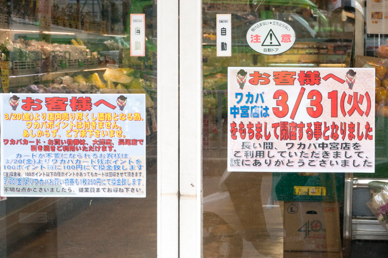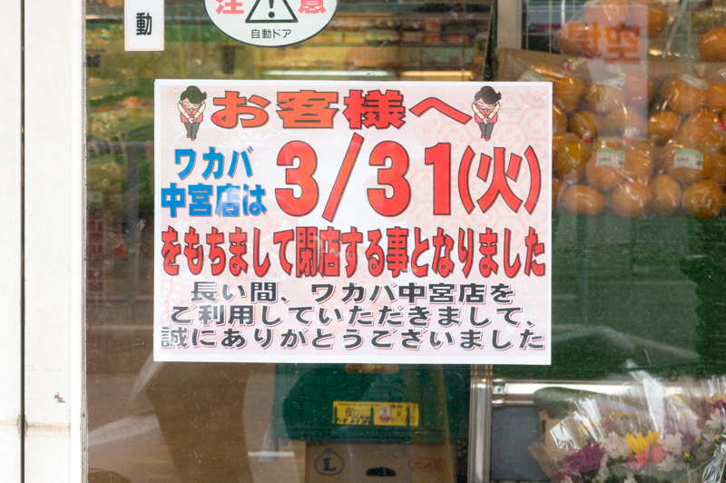中宮山戸町の「スーパーワカバ 中宮店」が3月31日に閉店するようです。