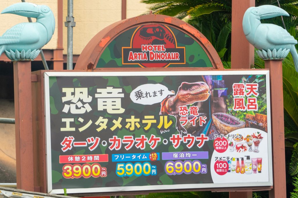そして気になる「恐竜ライド」の文字。休憩から宿泊まで、露天風呂もあって、カラオケにダーツにサウナ、フード・ドリンク200種類以上、アメニティ100種類以上……