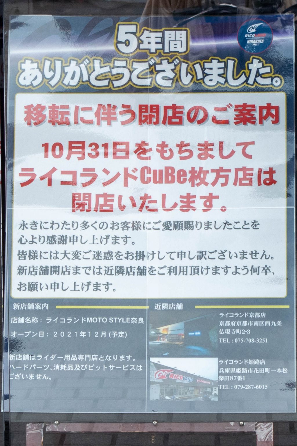 国道1号線沿い田口のジョーシン向かいにあるバイク用品店「ライコランド CuBe枚方店」が閉店するようです。