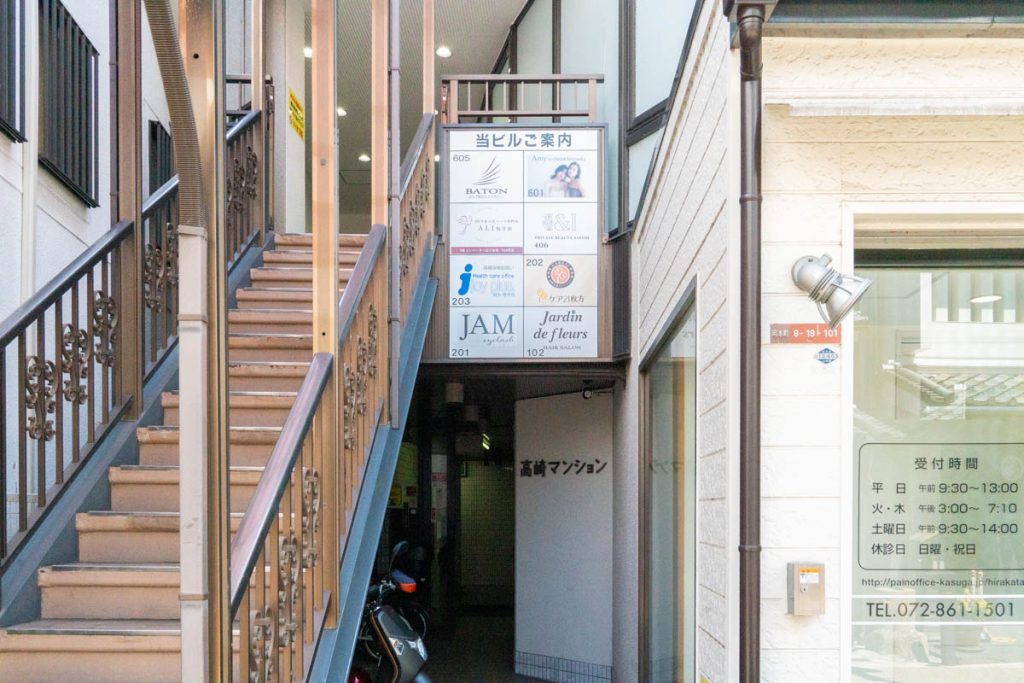 右にお店があるビル。枚方ビオルネや岡本町公園のちかくです。斜め向かいに「YORKIE COFFEE」がある位置。