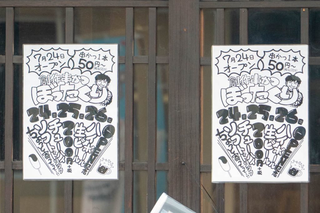 現地にあった貼紙によると、7月下旬に「創作串かつ ぼったくり」がオープンすることがわかります。