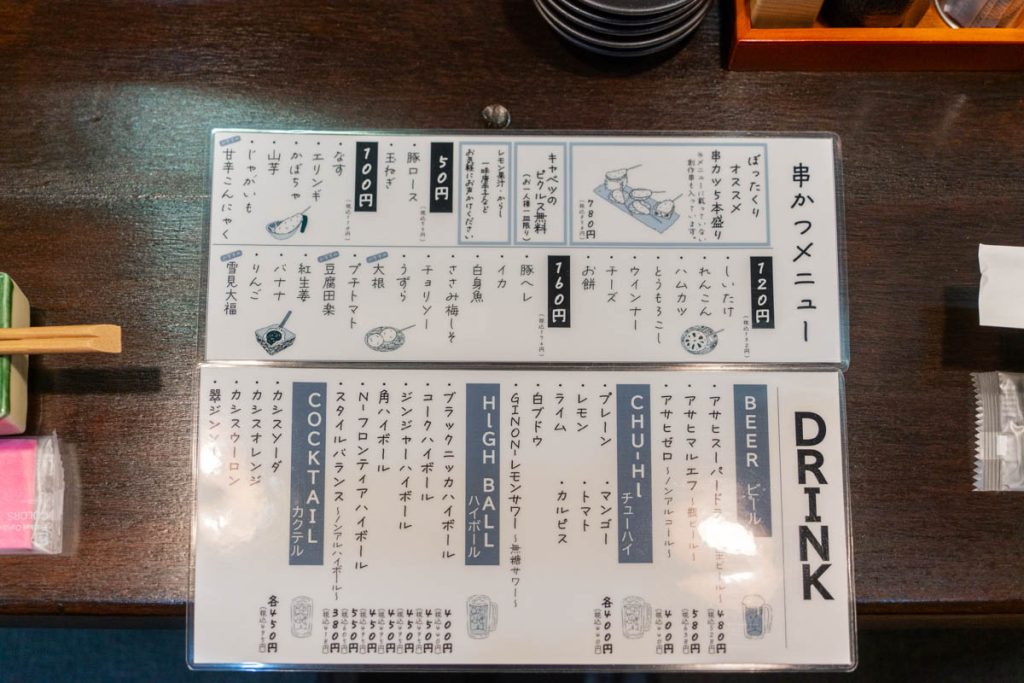 メニュー。個人的には雪見だいふくの串かつが気になりました。