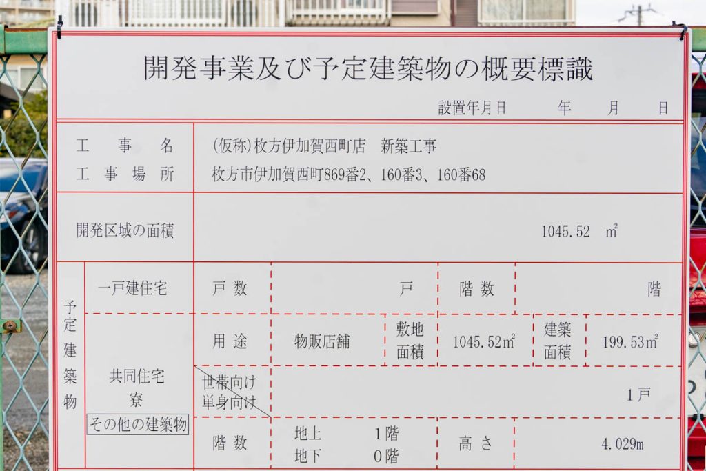 概要標識には1階建て物販店舗の文字。工事期間は不明で、建築主はファミリーマートでした。