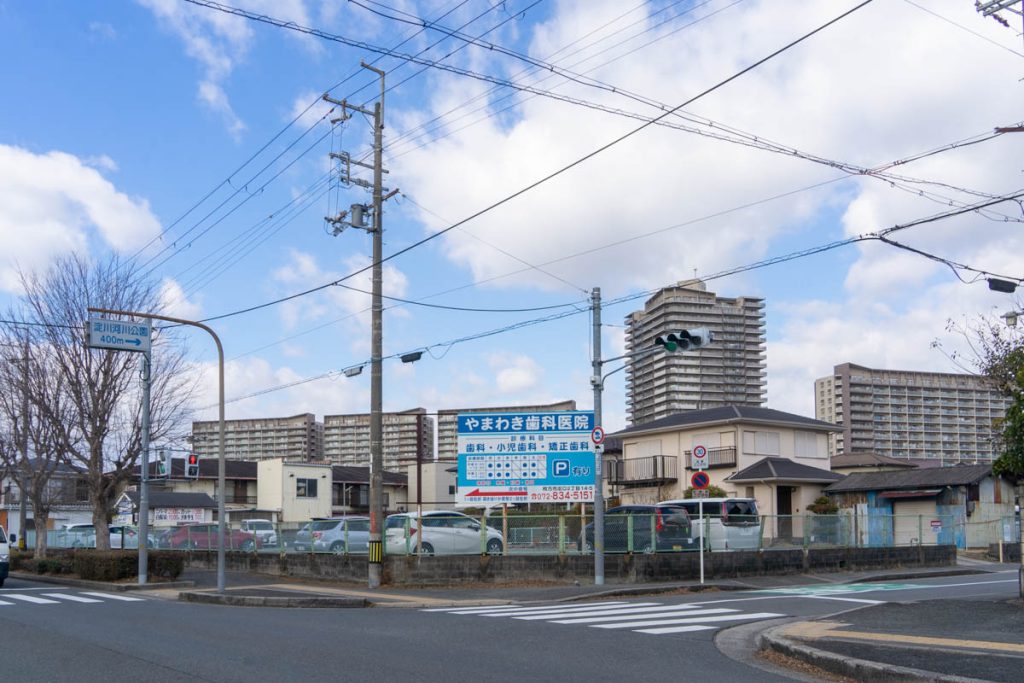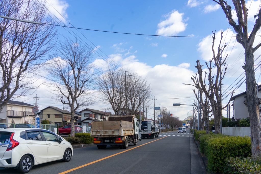 こっちにいくと、国道170号線の交差点「伊加賀緑町」です。奥に見えているのがひらパーの観覧車。