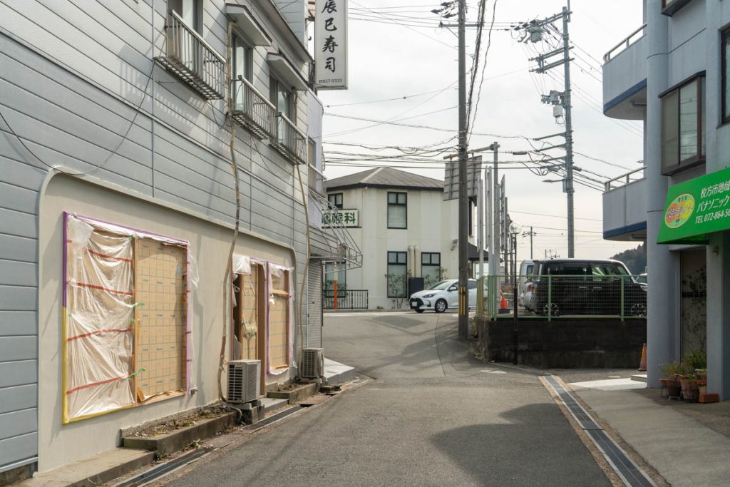 こっちにいくと府道736号線。長尾駅から徒歩3分ほどの場所にあります。