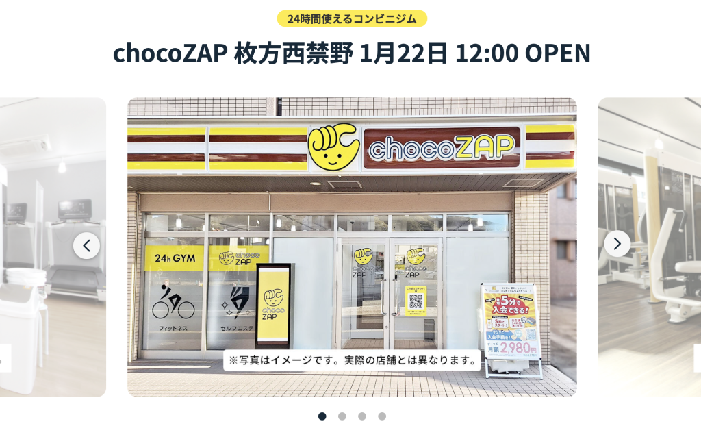 「chocoZAP」は、有名なジム『ライザップ』が作った24時間365日、全店舗利用可能なコンビニジム(→公式サイト)。枚方市内だと御殿山駅近く・枚方公園駅近く・東中振にも店舗があります。