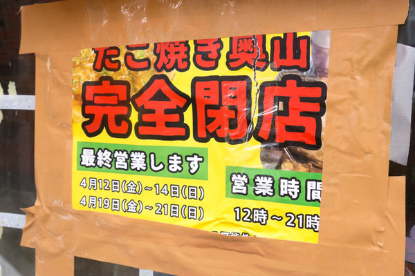香里園の屈んで通るトンネル先にあるたこ焼き店「たこ焼き奥山」が4月21日で閉店するようです。