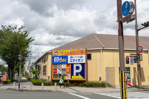 反対方向へ真っ直ぐ行くと、松井山手駅周辺へ。1つ目の交差点を左に行くとホームセンタームサシがあります。