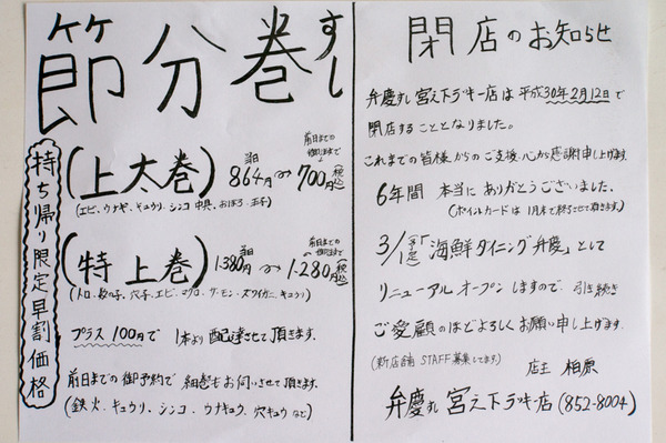 先ほどの案内の通り、閉店後は「海鮮ダイニング弁慶」として3月1日リニューアルオープン予定。