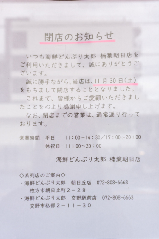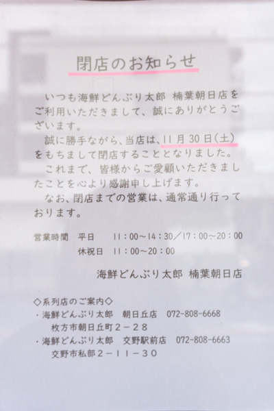 今回の閉店により、枚方市内にある「海鮮どんぶり太郎」は朝日丘店だけになりました。