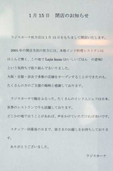 枚方市駅下にあるエル枚方のビストロバル「Buffo(ブッフォ)」が閉店していて、インド料理『ラジスカーナ 枚方店』は1月15日で閉店するようです。
