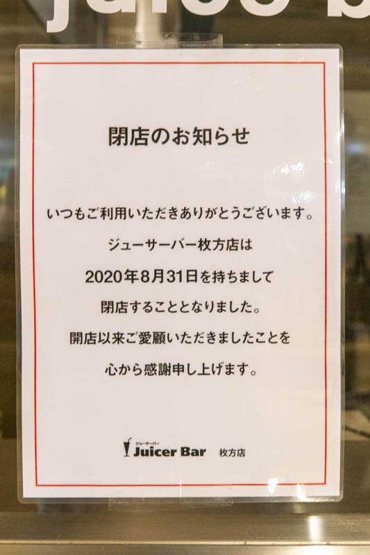 2018年には樟葉駅構内のジューサーバーも閉店しましたので、枚方市内にあるジューサーバーはなくなったことに。