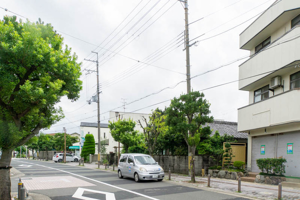 こっちへ中宮平和ロード沿いに進んで行くと交差点があり、そこを右に行くと関西外国語大学が。左に行くと坂道を下って枚方市駅方面。