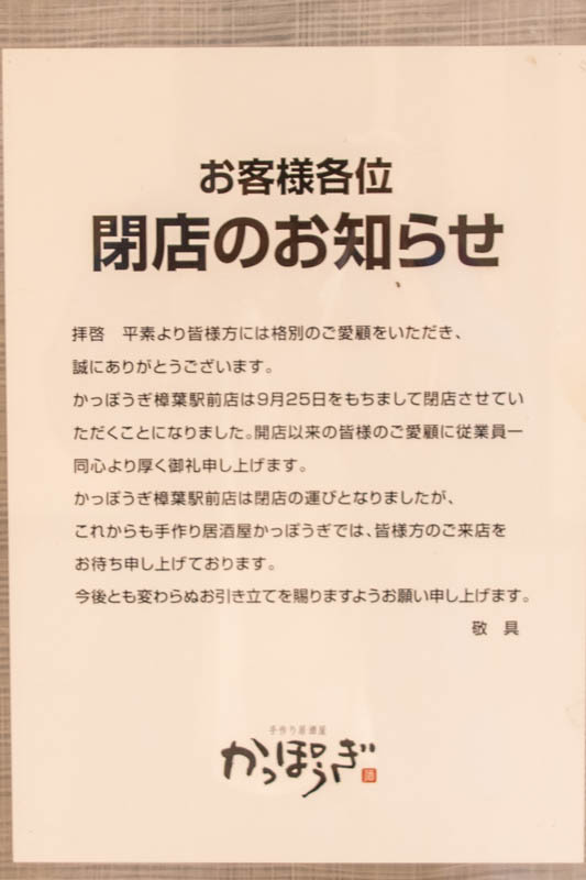 樟葉駅そばにあるエルくずはの「手作り居酒屋 かっぽうぎ 樟葉駅前店」が閉店しています。