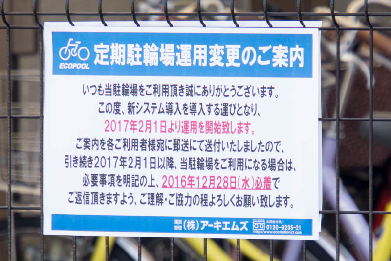 隣接している光善寺サイクルの駐輪場は新システムを導入するとの張り紙がこの時点ではありました。