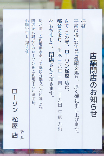 香里園の「ローソン 松屋店」が2月29日で閉店するようです。