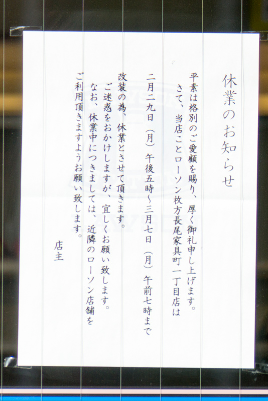 こちらのローソンは2月29日17時〜3月7日7時まで改装のため休業するとのこと。