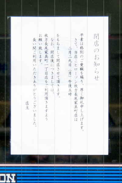 2月末に閉店するローソンといえば他に「ローソン 松屋店」もありますし、枚方市近隣でローソンの閉店が続くことになりますね。
