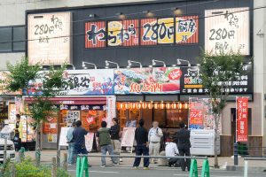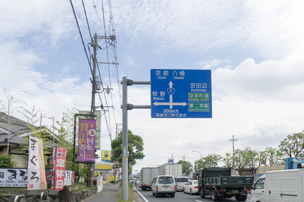 京都方面には焼肉いただき、餃子の王将、エディオンなどがあります。