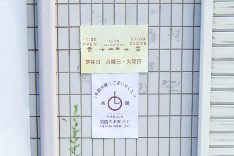 府道144号線沿い天之川町にあるカフェ「Cafe Gallery Marula」が閉店しています。