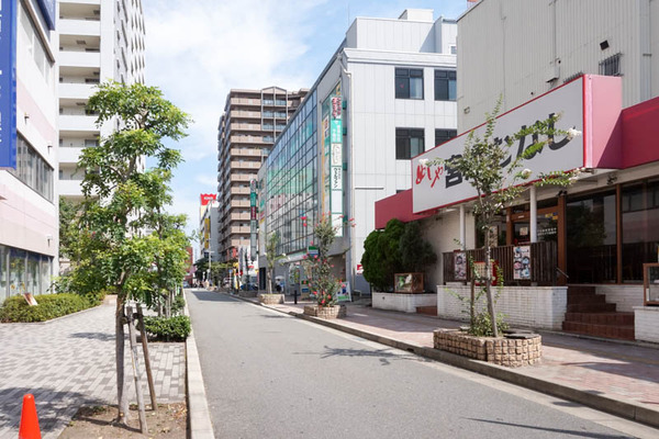 反対方向にはファミリーマートやチファジャなどがあるビルがあり、進んでいくとカラオケバンバンや万代などがある府道148号線に出ます。