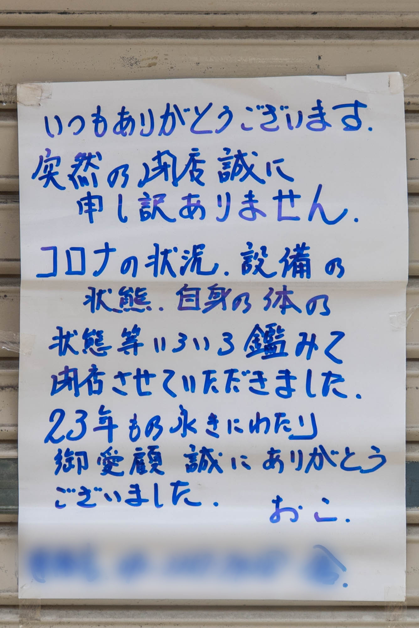 これまで何か告知がある時は必ず1ヶ月以上前から貼紙で告知してきたものの、閉店に関しては本当に突然で、閉店の告知ができなかったことを悔やんでいるとおっしゃってました。