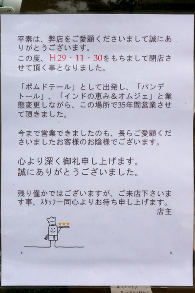 貼紙の案内にもある通り、こちらの店舗は「ポムドテール」→「パンデトール」→「インドの恵み&オムジェ」という流れで業態変更しているお店で、ひらつーグルメでも紹介したこともあります。