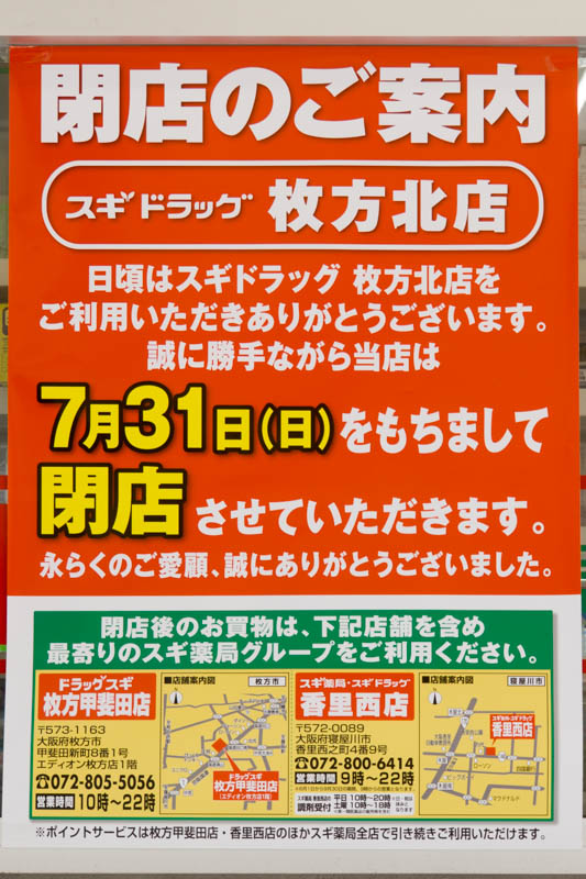 途中の張り紙にもありましたが、このスギ薬局が閉店となると1号線のライフとエディオンの建物内に入っている枚方甲斐田店が最寄りのスギ薬局になると思われます。