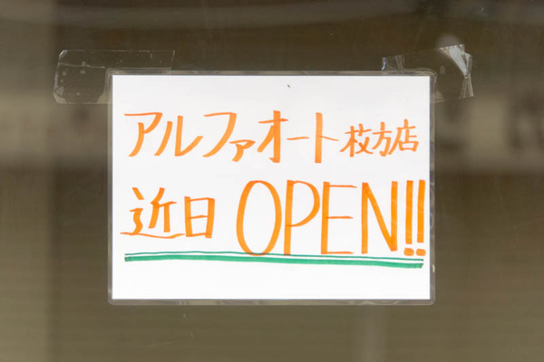 店先にあった張り紙。アルファオートが近日オープンとのことで、もう1つの張り紙にはくずはにある本店の名前が記載されていたので、くずはのお店の系列店であることは間違いなさそう。