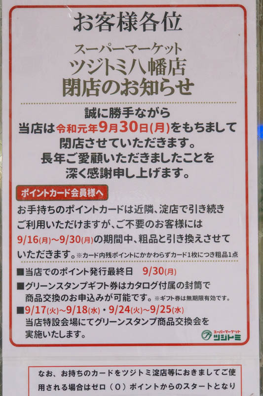 八幡市駅前にあるスーパーマーケット「ツジトミ 八幡店」が閉店するようです。
