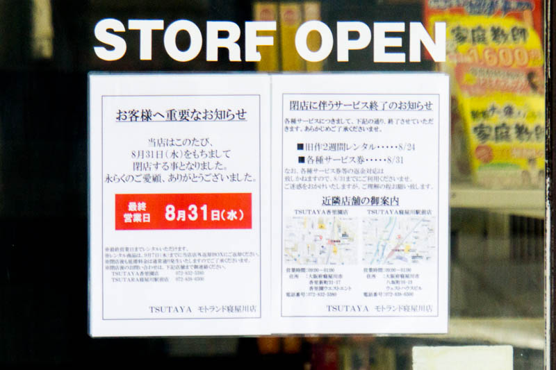旧1号線ぞい寝屋川の「TSUTAYAモトランド寝屋川店」が8月31日で閉店するようです。
