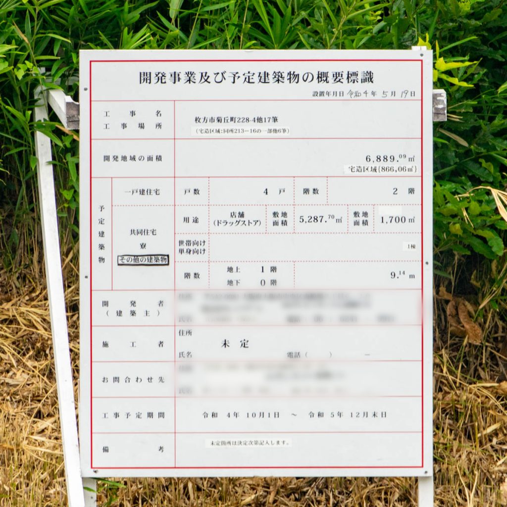 場所は地番になっていて、枚方市菊丘町243番1。ちょっと場所の詳細はわからないんですが、菊丘町の立地的には以前記事にしたドラッグストアができる場所が候補の1つになりますね。