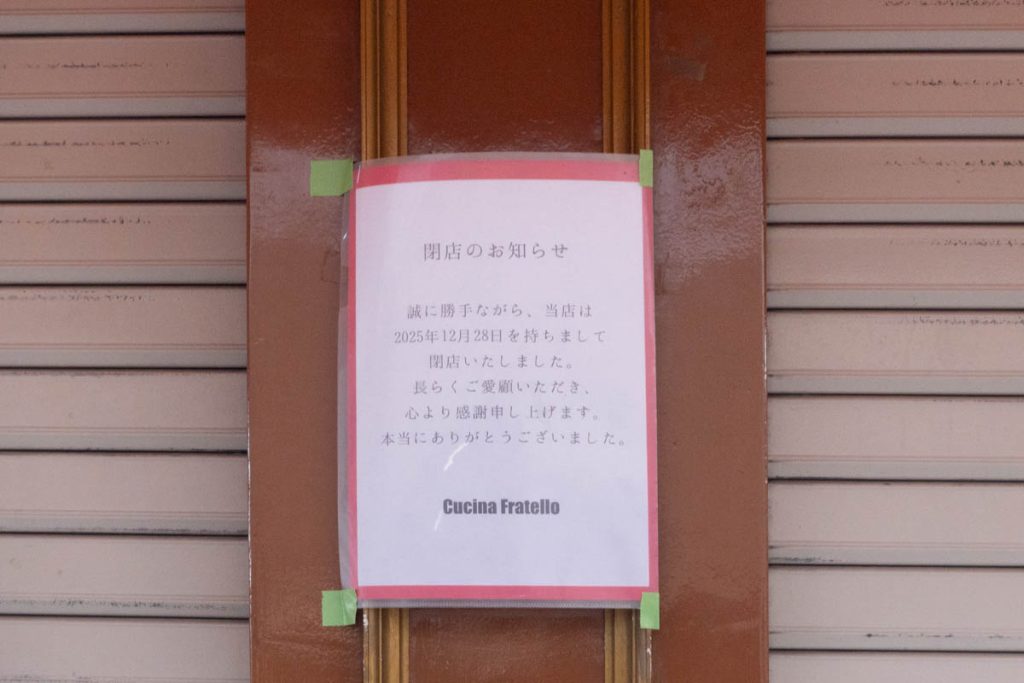 香里園駅近くの「Cucina Fratello(クッチーナ フラテッロ)」が閉店しています。