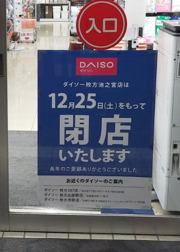 中宮中学校向かいの「ダイソー枚方池之宮店」が12月25日をもって閉店するようです。