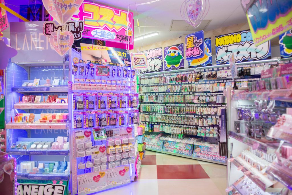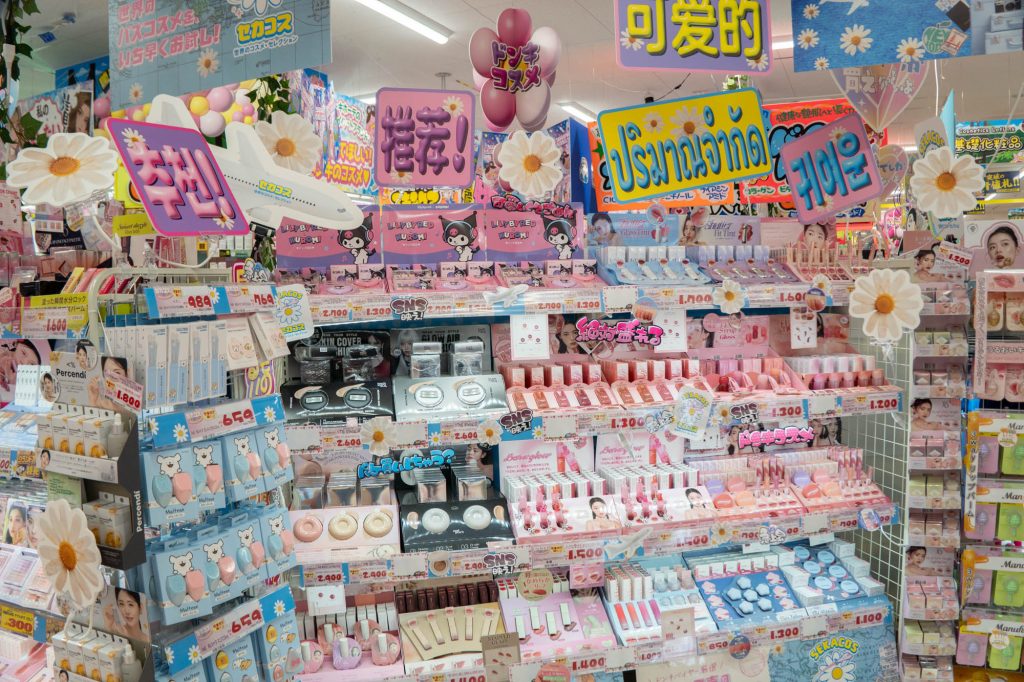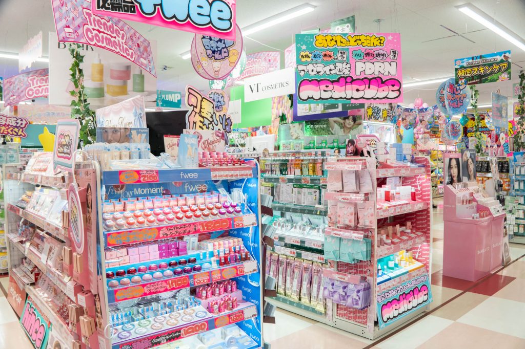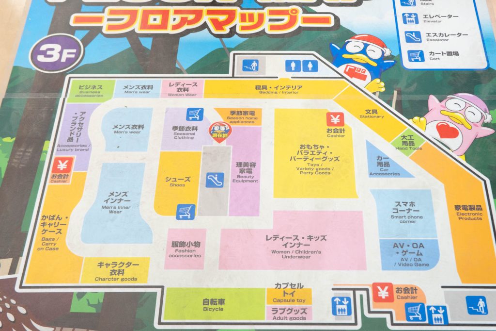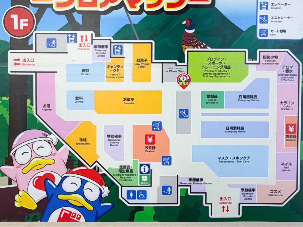 1階は主に売場面積が府内最大級のコスメ・品揃えが府内最大級のカラコン・日用消耗品・トレーニング用品・お菓子・飲料・お酒・医療品など。