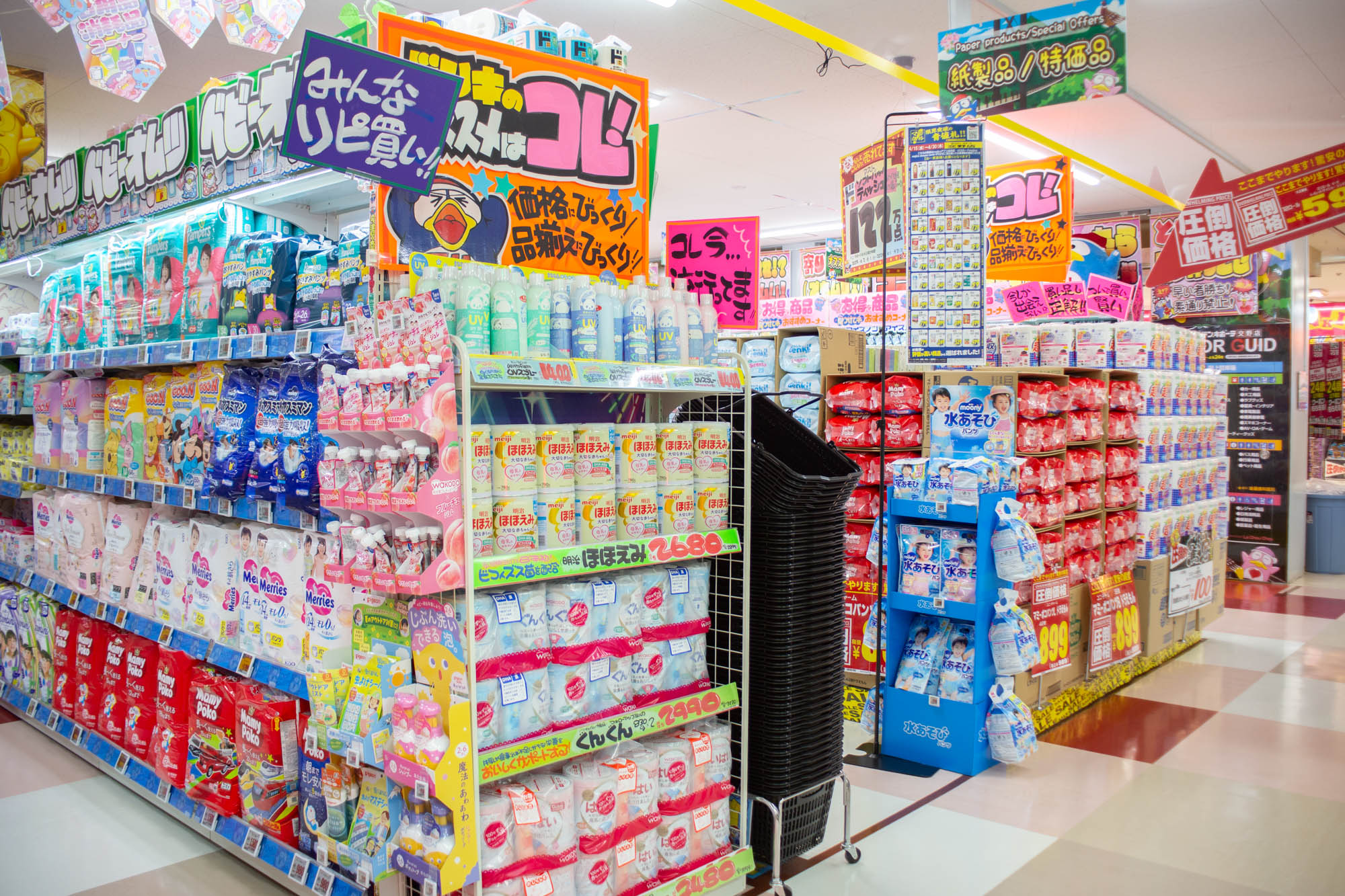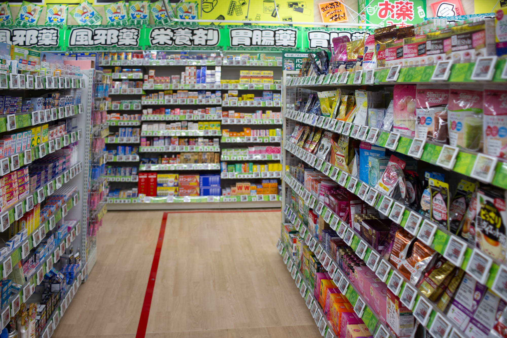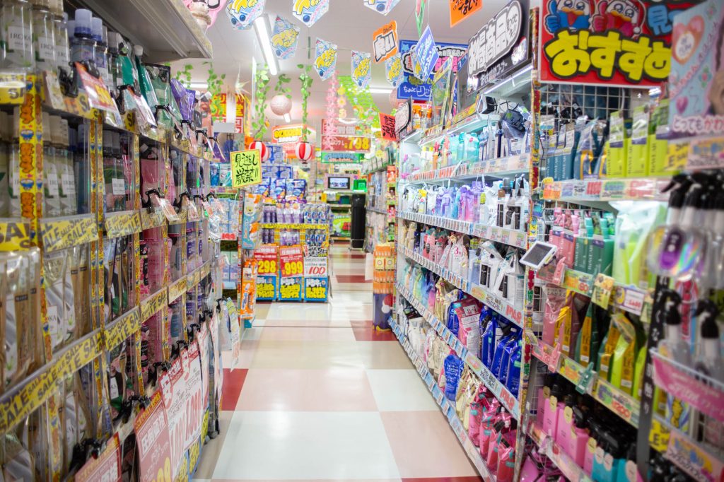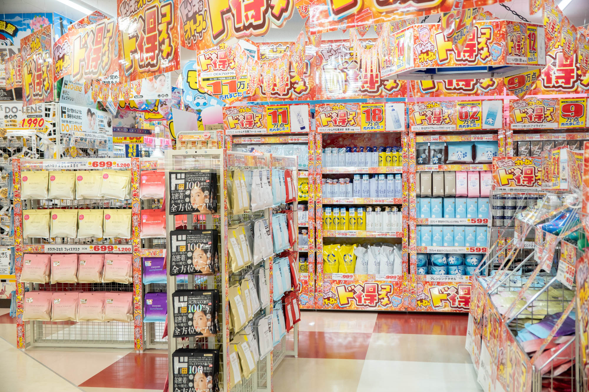 1階は主に売場面積が府内最大級のコスメ・品揃えが府内最大級のカラコン・日用消耗品・トレーニング用品・お菓子・飲料・お酒・医療品など。
