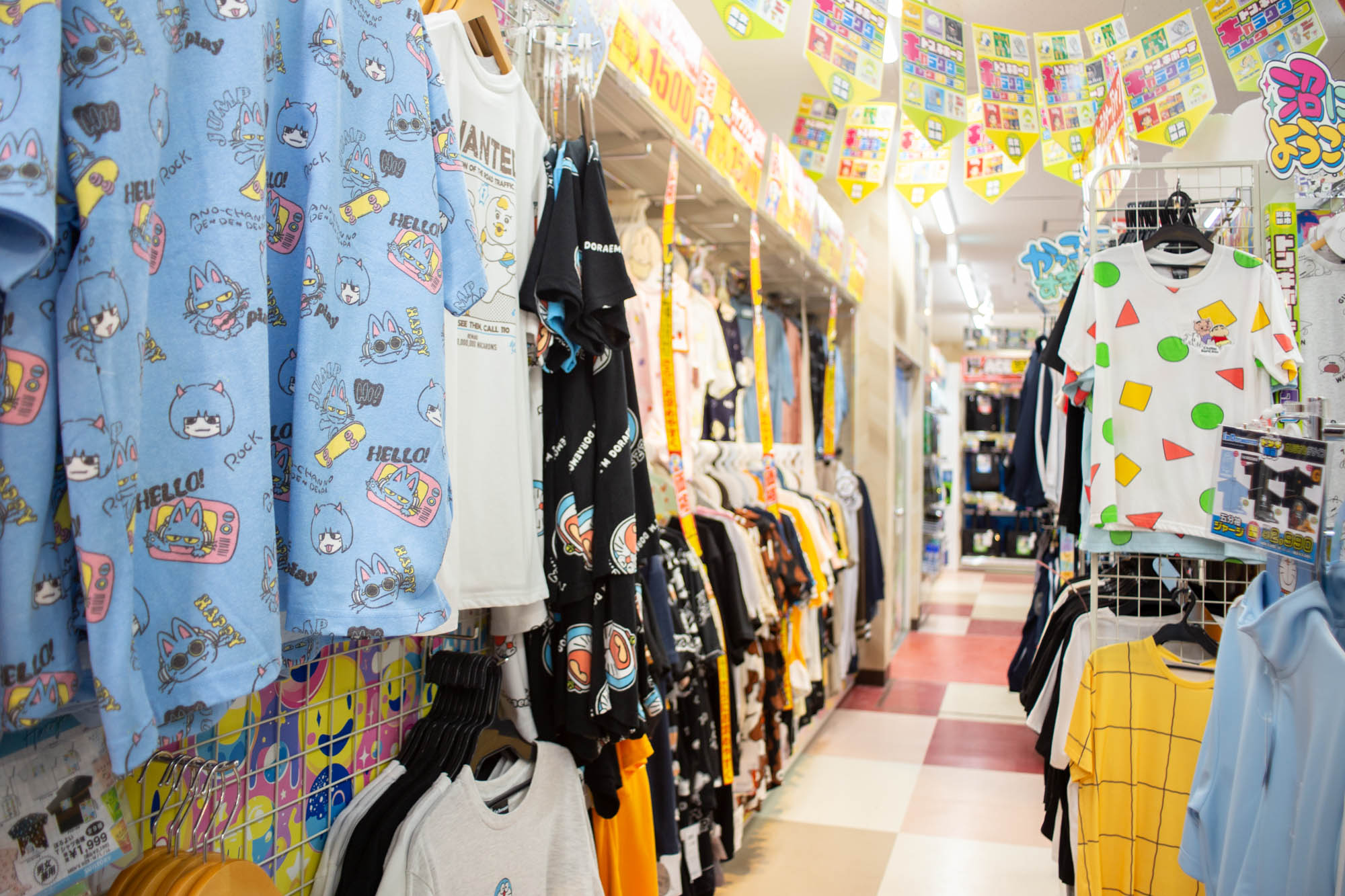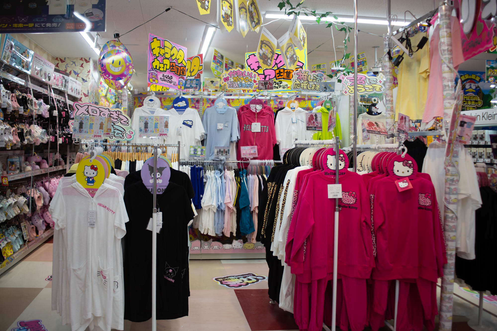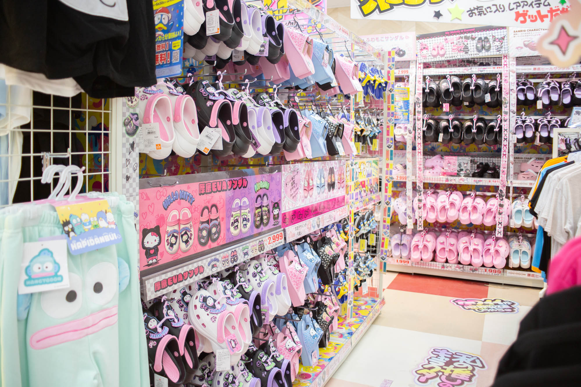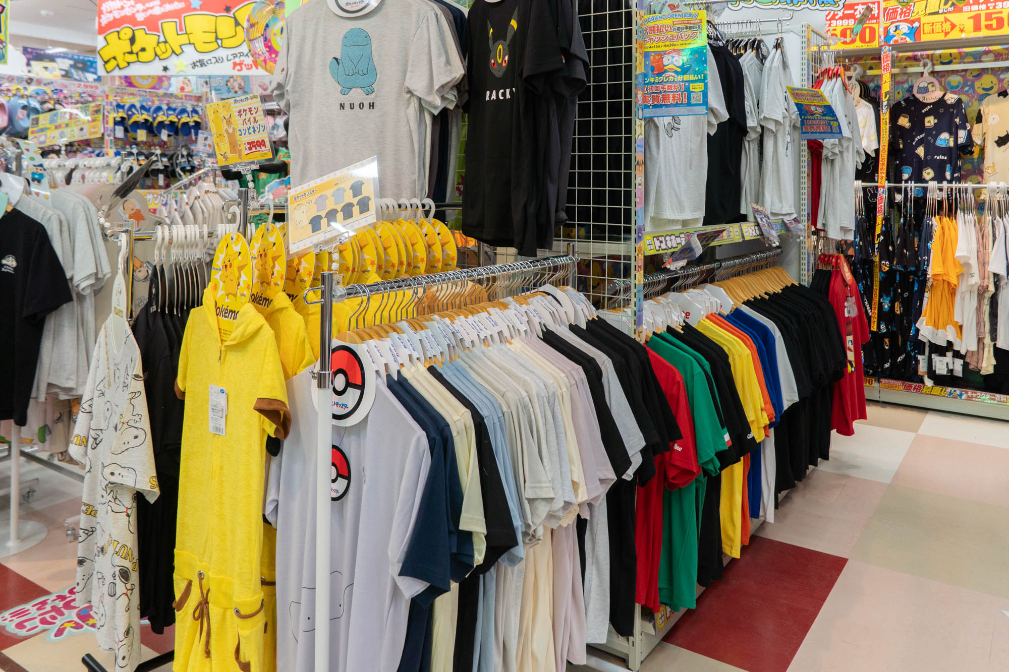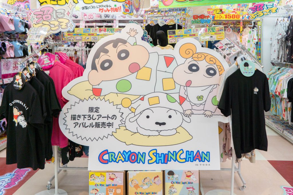 クレヨンしんちゃんなど、人気キャラクターのアパレルがたくさん!サンダルもめっちゃあったな〜!