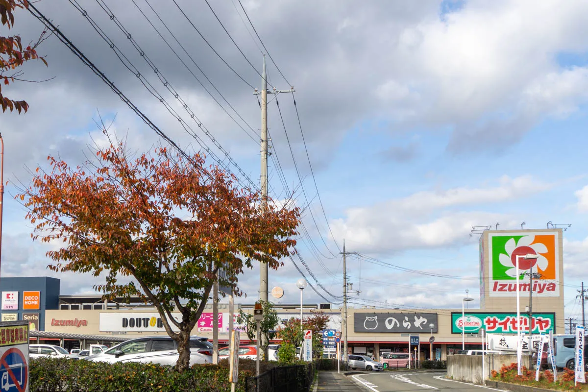 反対方向には八幡小学校やサガミなどが。向かいにはファミレやわた。