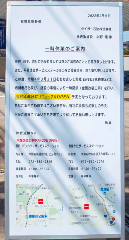 東香里のガソリンスタンド「ENEOS 東香里SS」が一時閉店しています。