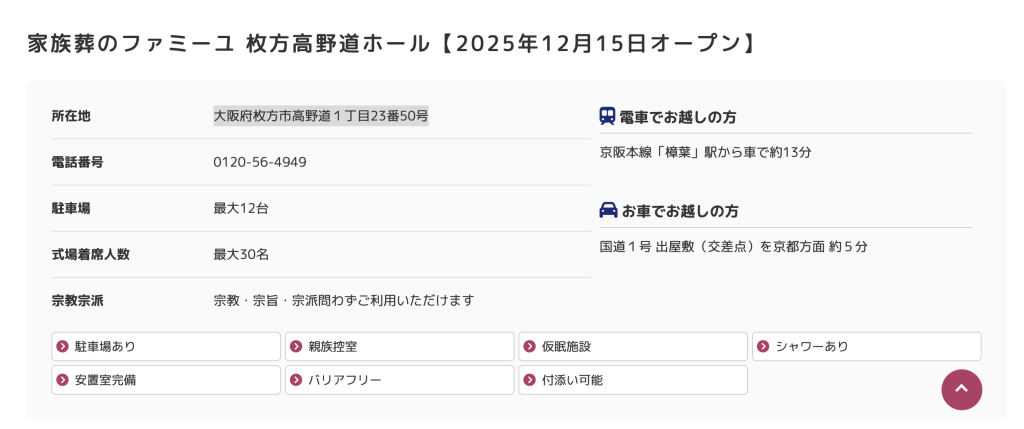「家族葬のファミーユ」は1日1組貸し切りの家族葬式場(→公式サイト)。枚方市内だと茄子作・甲斐田東町・長尾元町にもあります。