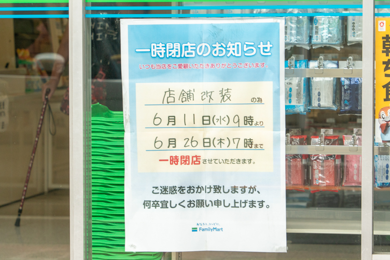 店頭の貼紙によると、店舗改装のため6月11日9時から26日7時まで休業する模様。となると6月26日7時にリニューアルオープンということでしょうか。